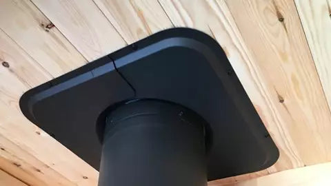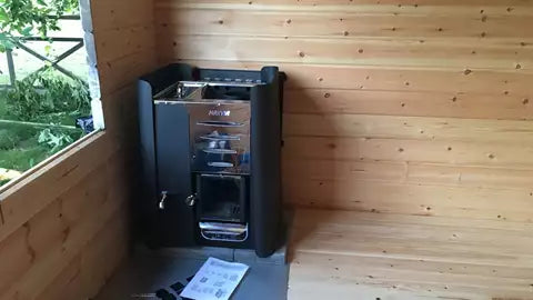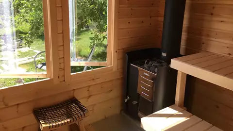 Da taket var ferdig, var det på tide å installere badstuovnen og skorsteinen sammen med Davids egne vinklede badstubenker.