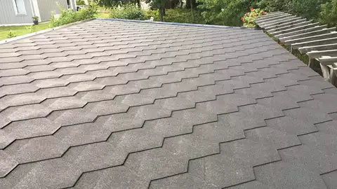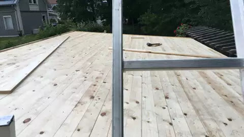 Her har David satt sammen rammen til badstuhytta og begynt å legge råplater på taket. Da det var gjort, var det bare å legge underlagspapp og til slutt takshingel.