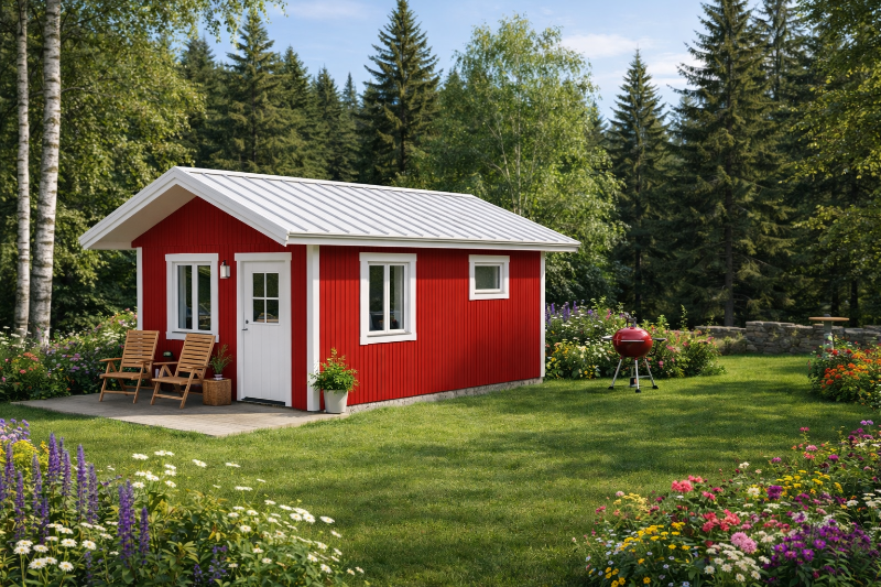 HUSKONFIGURASJON - 1.0.4259689 ═ BYGNING: • Størrelse: 3,8 × 6,10 m (23,18 m²) • Vegghøyde: 2,387 m • Taktype: Takstol med fagverk • Veggfarge: Ubehandlet TEKNISKE SPESIFIKASJONER: • Takvinkel: 22° • Topphøyde: 3558 m • Lengde på rygg: 7080 m • Lengde fra møne til takskjegg: 2,578 m ISOLASJON: • Takhøyde: 0 mm • Vegg: 0 mm