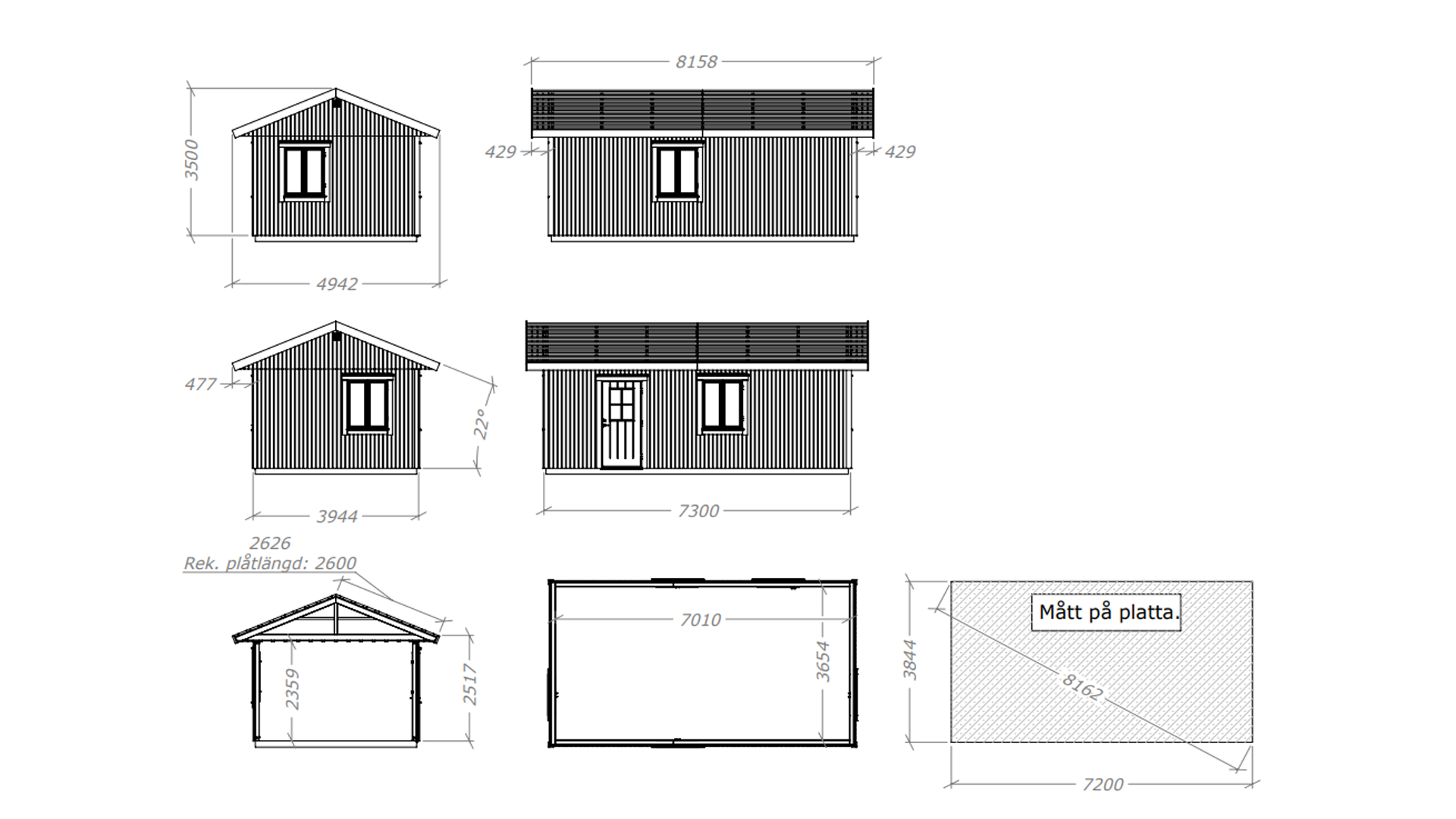 Utv. Mått: 394,4x730 cm / Inv.mått: 364x699,6 cm. Total höjd 3,68 m inkl. platta 15 cm.