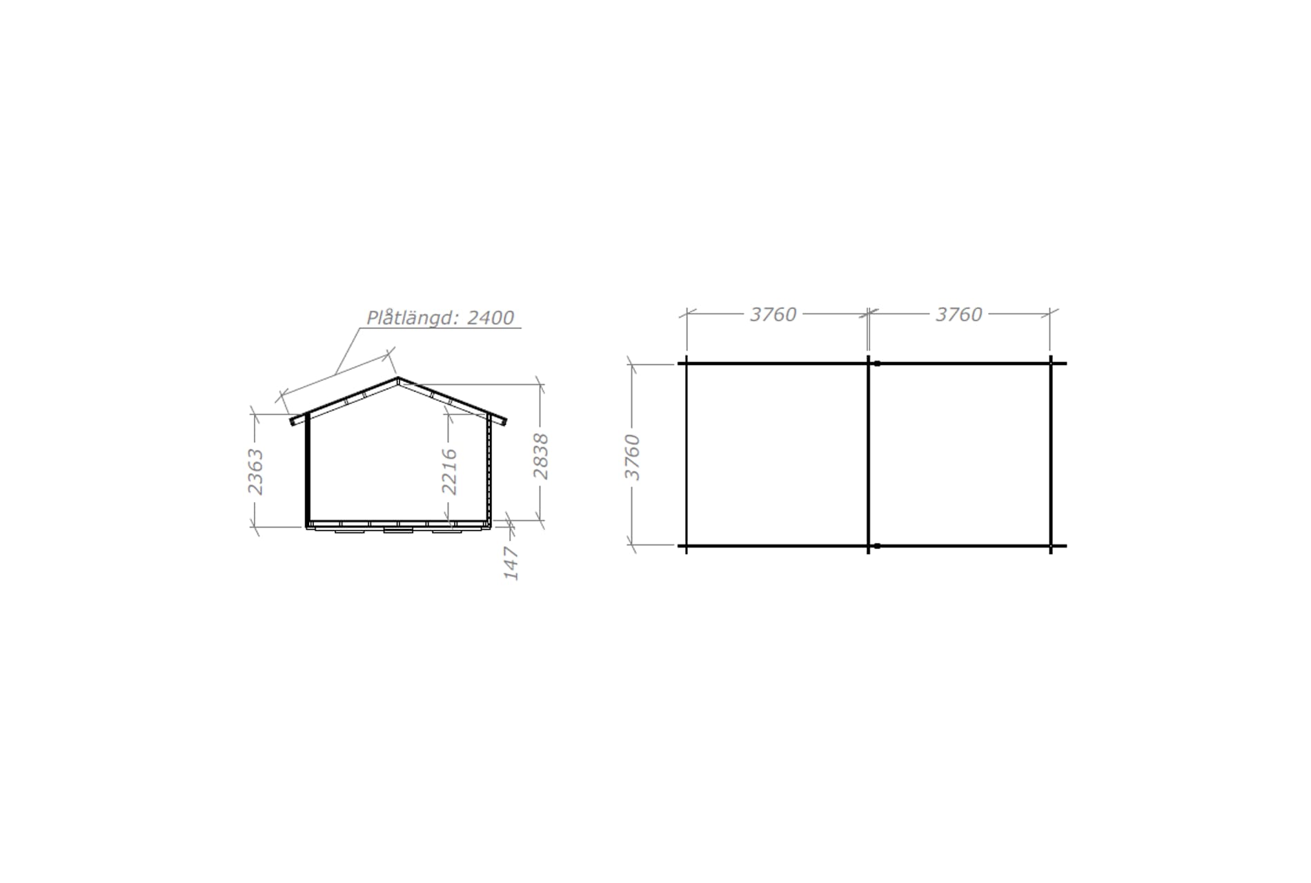 Utv. mått: 766 × 385 cm / Inv. mått inre rum: 376 x 376cm