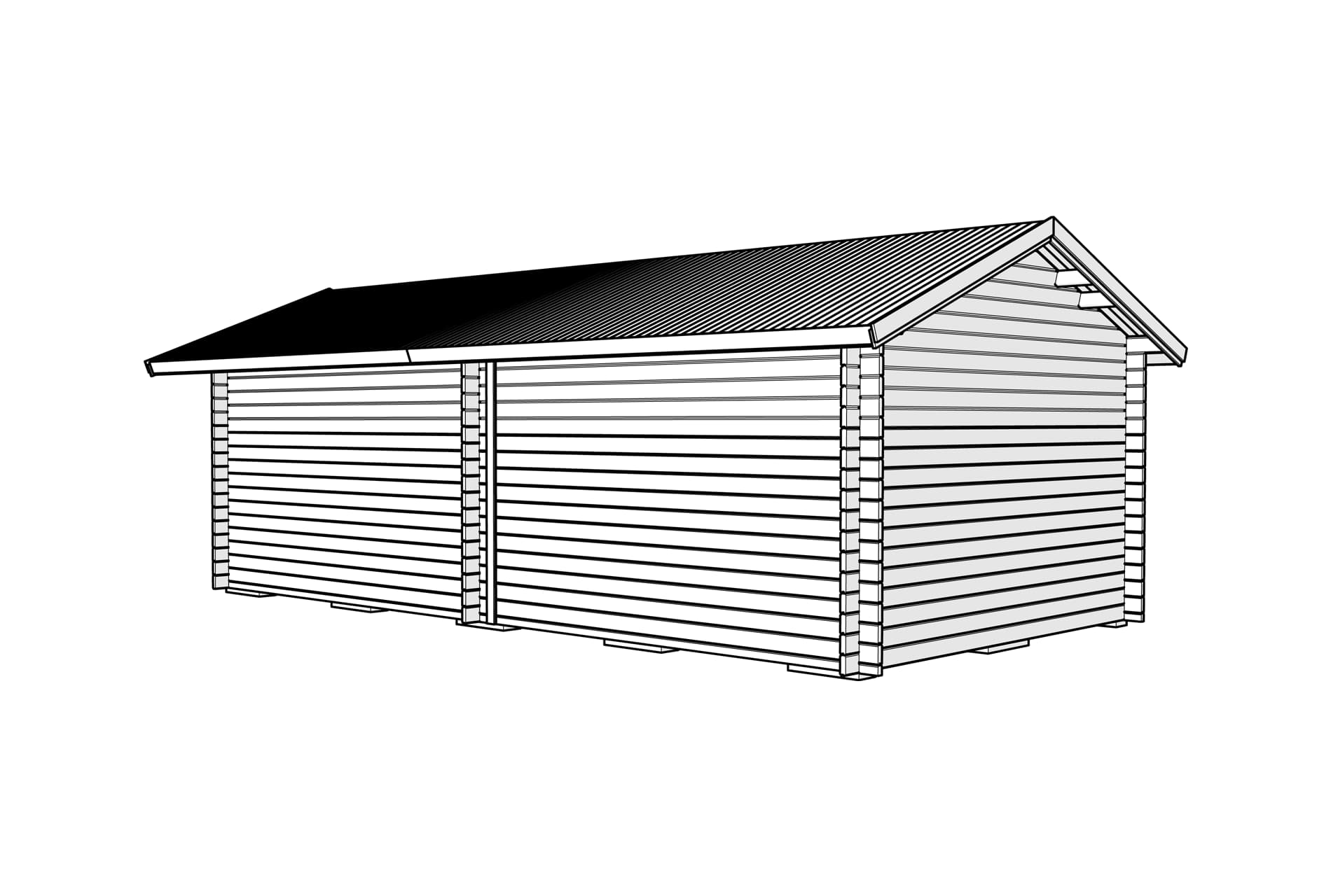 45x145mm profilhyvlat, geringsknutat timmer med infräst spår och tätningslist till knutar och spont samt en inknutad mellanvägg.