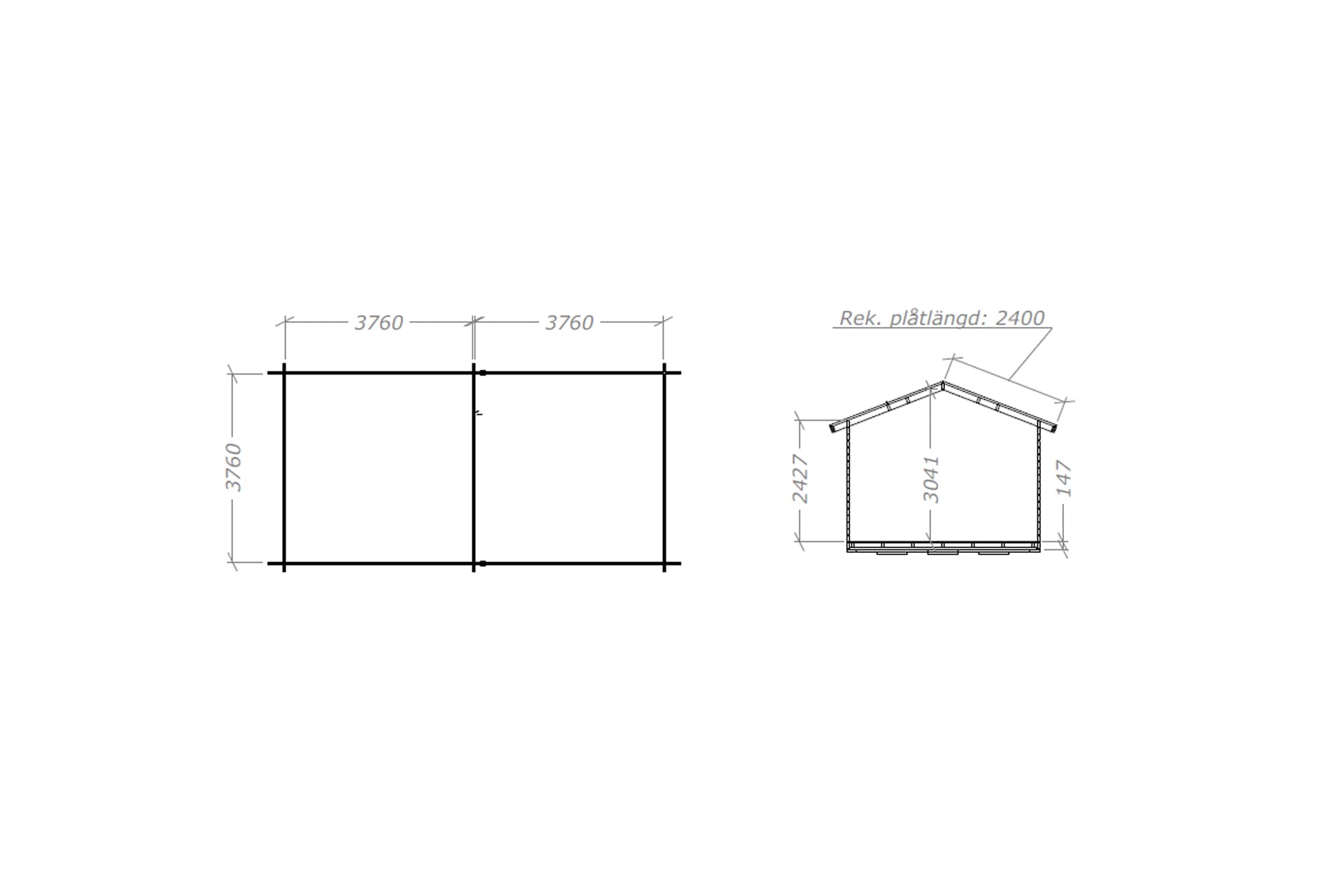 Utv. mått: 765,5 × 385 cm / Inv. mått inre rum: 376 x 376cm & 376x376cm (15+15m2)