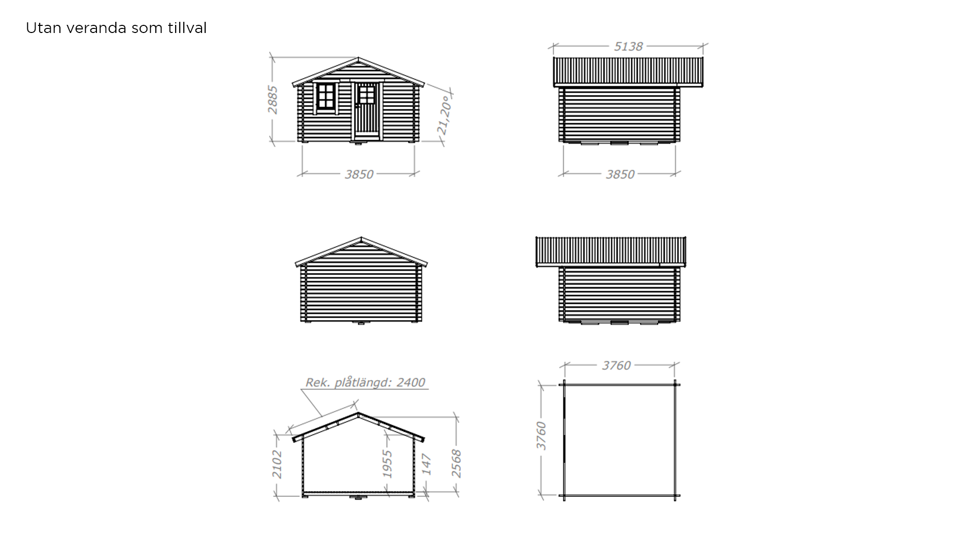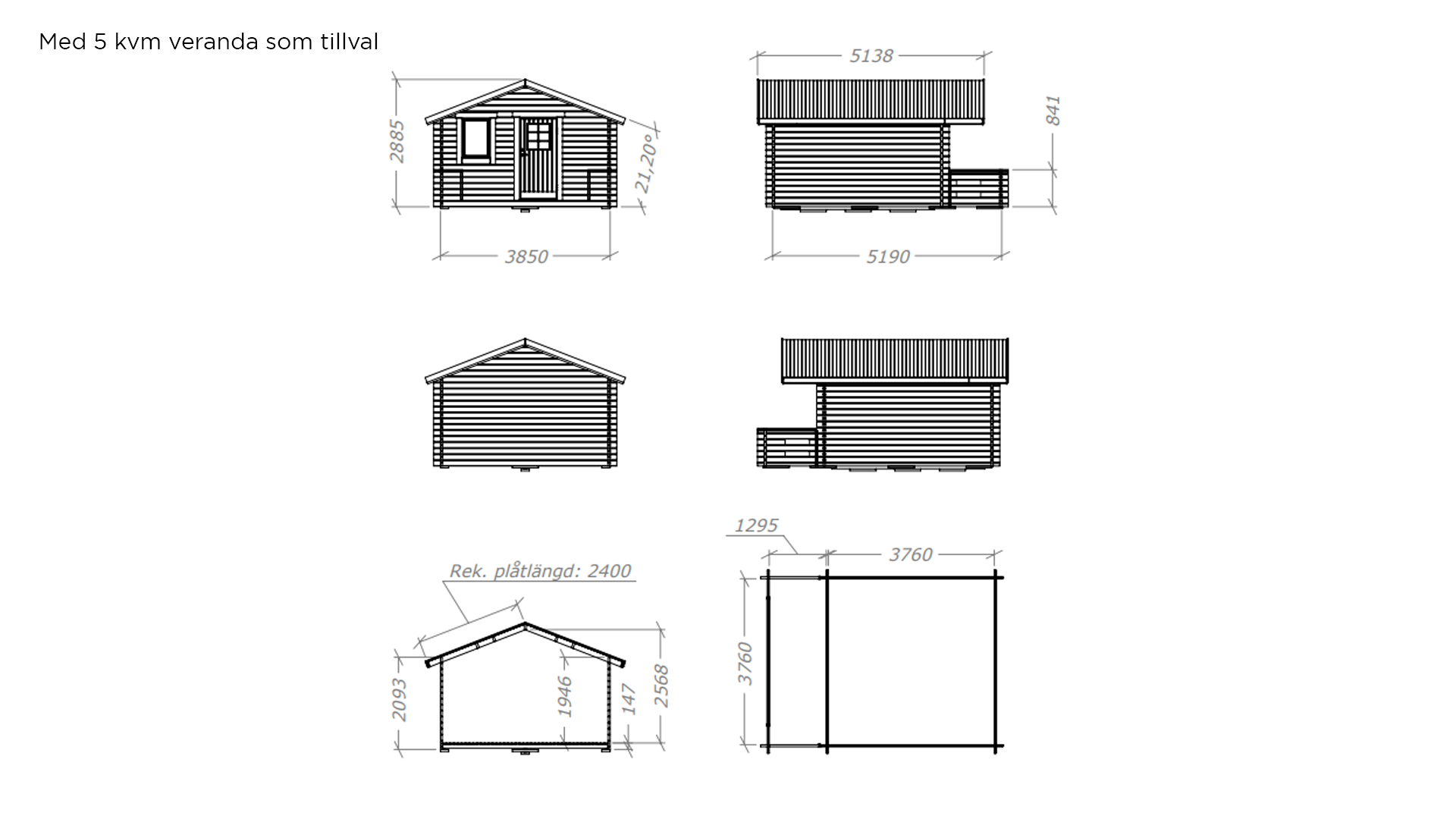 Yttre takbeklädnad (takshingelpaket finns som tillbehör) Handtag och låscylinder (finns som tillbehör) Spröjs till fönster (finns som tillbehör) Skruvsats (finns som tillbehör) Veranda 5m² (finns som tillbehör)