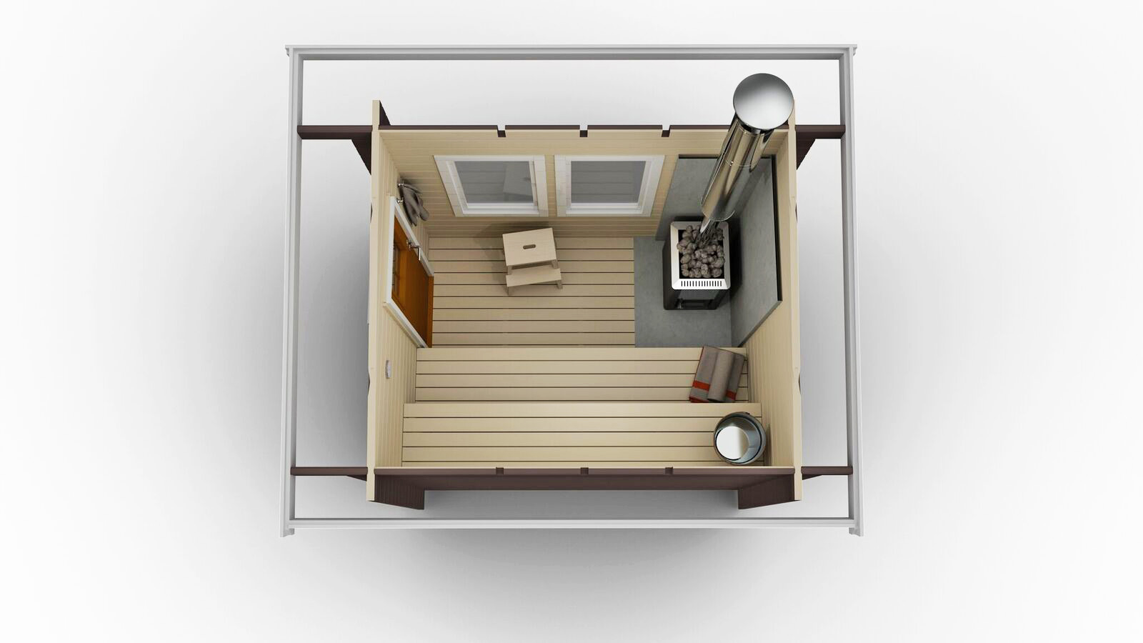 Badstueflåte 4-6 personer. Flåte 6,0x4,8 (29 kvm) med badstue 5 kvm med skråtak. Pakken inneholder Harvia 20 Pro vedfyrt badstuovn, takshingel, takpapp og dørhåndtak med lås.