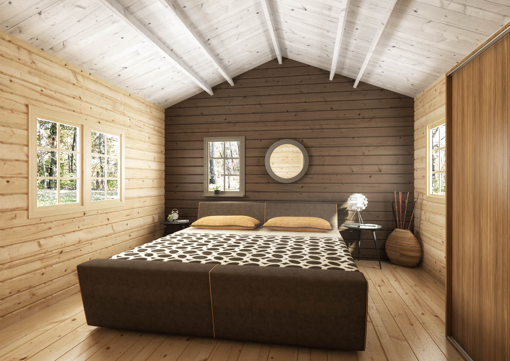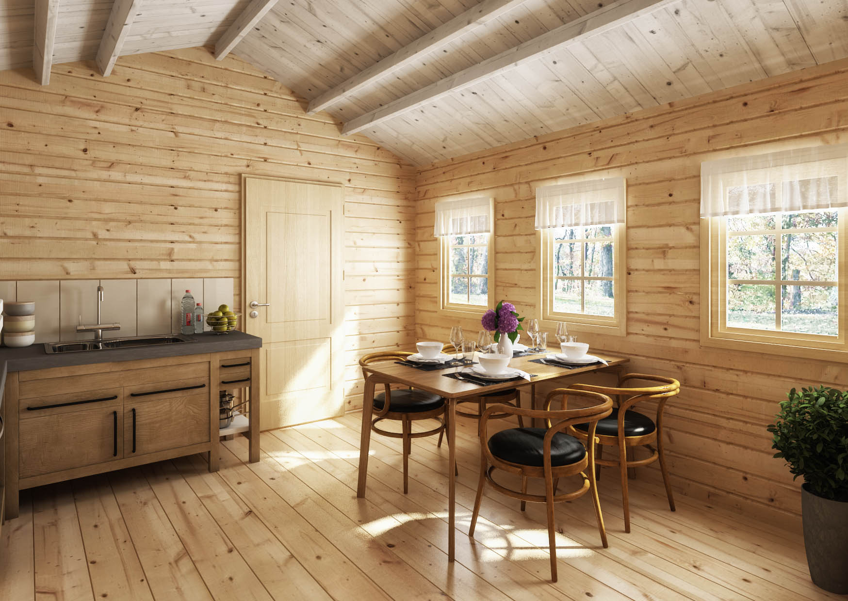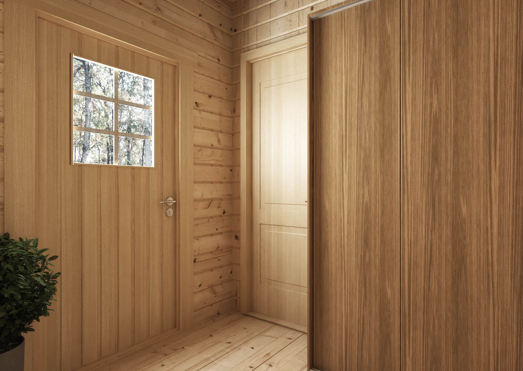 45x145mm profilhyvlat, geringsknutat timmer med infräst spår och tätningslist till knutar och spont. Mellanväggarna som delar av stugan levereras med hål för innerdörrar, placering se ritning. Det går även att göra öppningen i mellanväggen större ifall man vill ha en mer öppen planlösning.