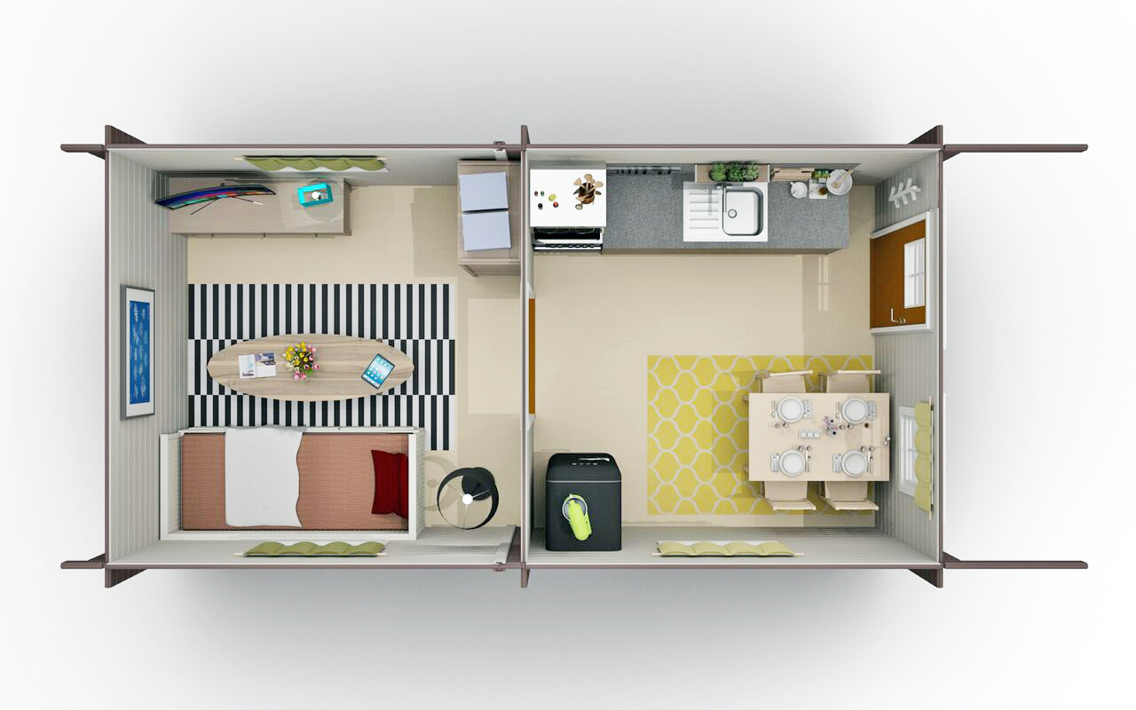 Du kan velge å installere et mindre kjøkken med en liten ovn eller mikrobølgeovn for enkel og praktisk matlaging. Møbler så med spisebord eller sittegruppe for å få et praktisk allrom. Siden skilleveggen kommer uten åpning, har du mulighet til å designe hyttas interiørdesign selv ved å plassere åpningen der du trenger det mest. For en mer åpen planløsning, velg en større åpning mellom stue og soverom. Ønsker du derimot at soverommet skal være mer privat, kan du sette inn en dør mellom rommene.