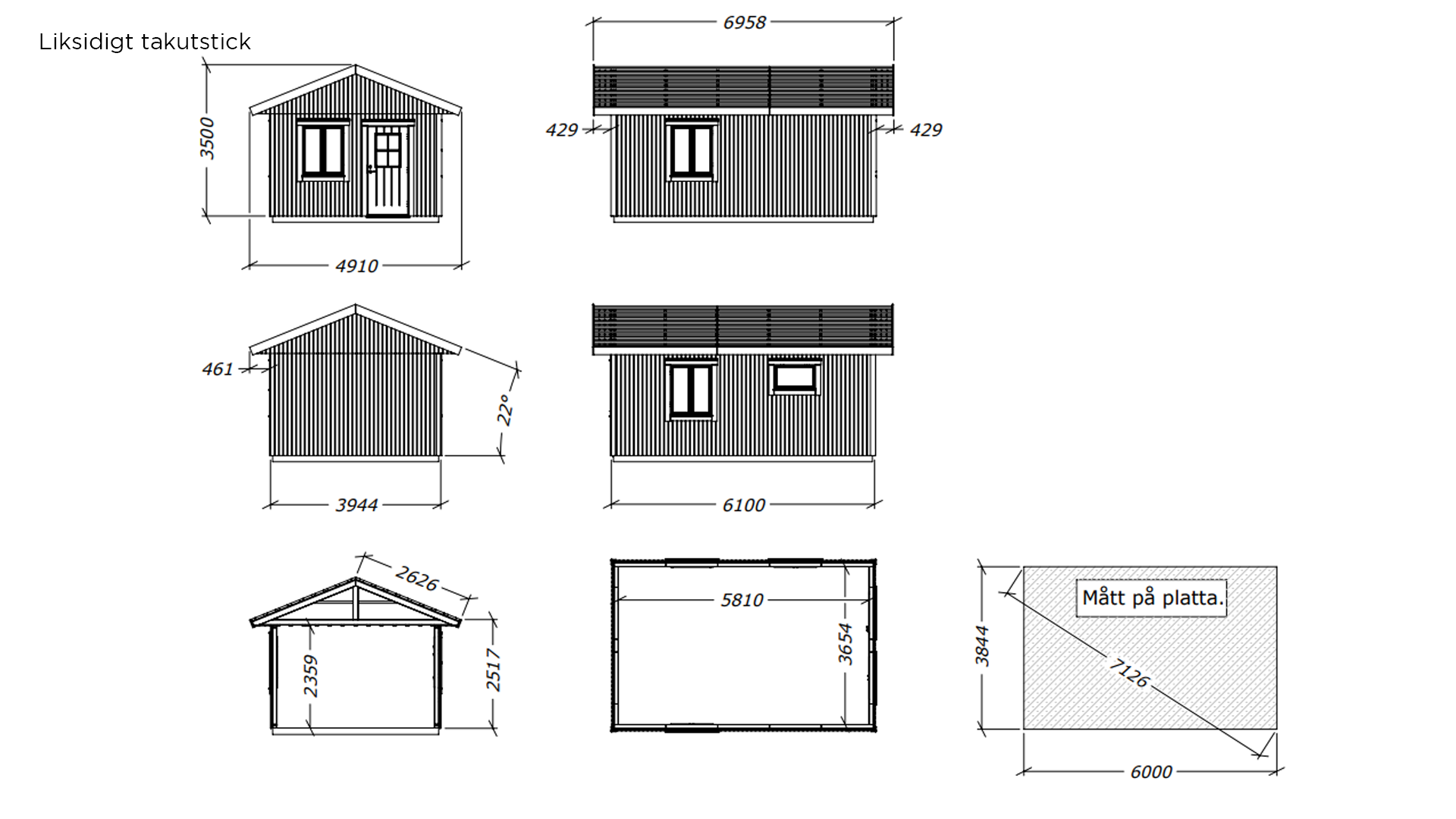 Plåttaken innehåller: takplåt i full längd, fotplåt, nockplåt, vindskivebeslag, tätningsband samt skruv