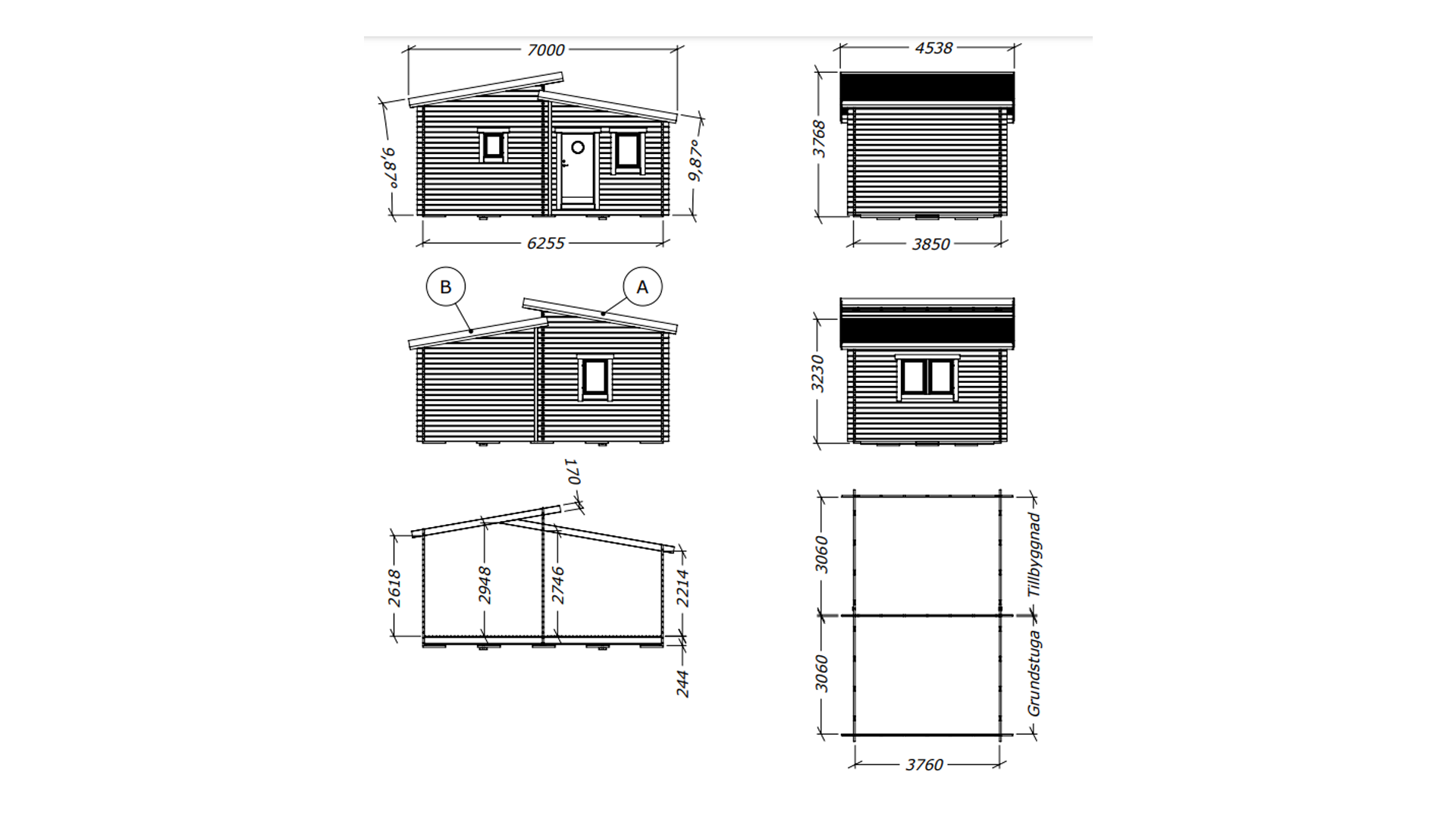 45x145mm profilhyvlat, geringsknutat timmer med infräst spår och tätningslist till knutar och spont samt en inknutad mellanvägg. Mellanväggen som delar av stugan levereras hel utan öppning. Kunden får själv ta upp och anpassa öppningen i mellanväggen till en större eller till en alt. två mindre dörröppningar efter eget önskemål.