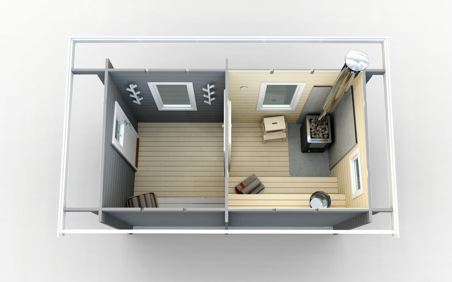 Utv. mått: 385 × 207 cm / Inv. mått omklädningsdel: 173,5 x 198cm Bastudel: 198 x 198cm