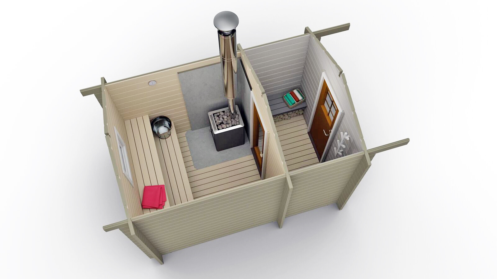 Badstuhytte Getskär 6,5 kvm er vår minste badstuemodell med garderobe. Den kompakte badstuen er rask å varme opp og du kan raskt nyte et deilig badstuebad.