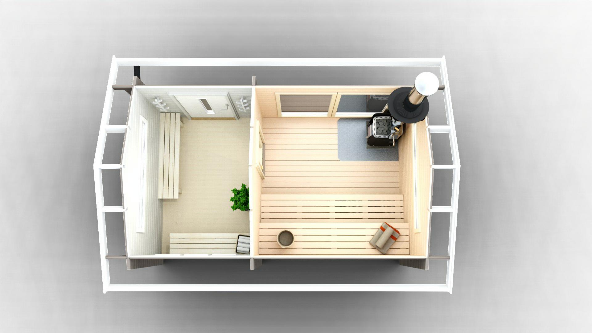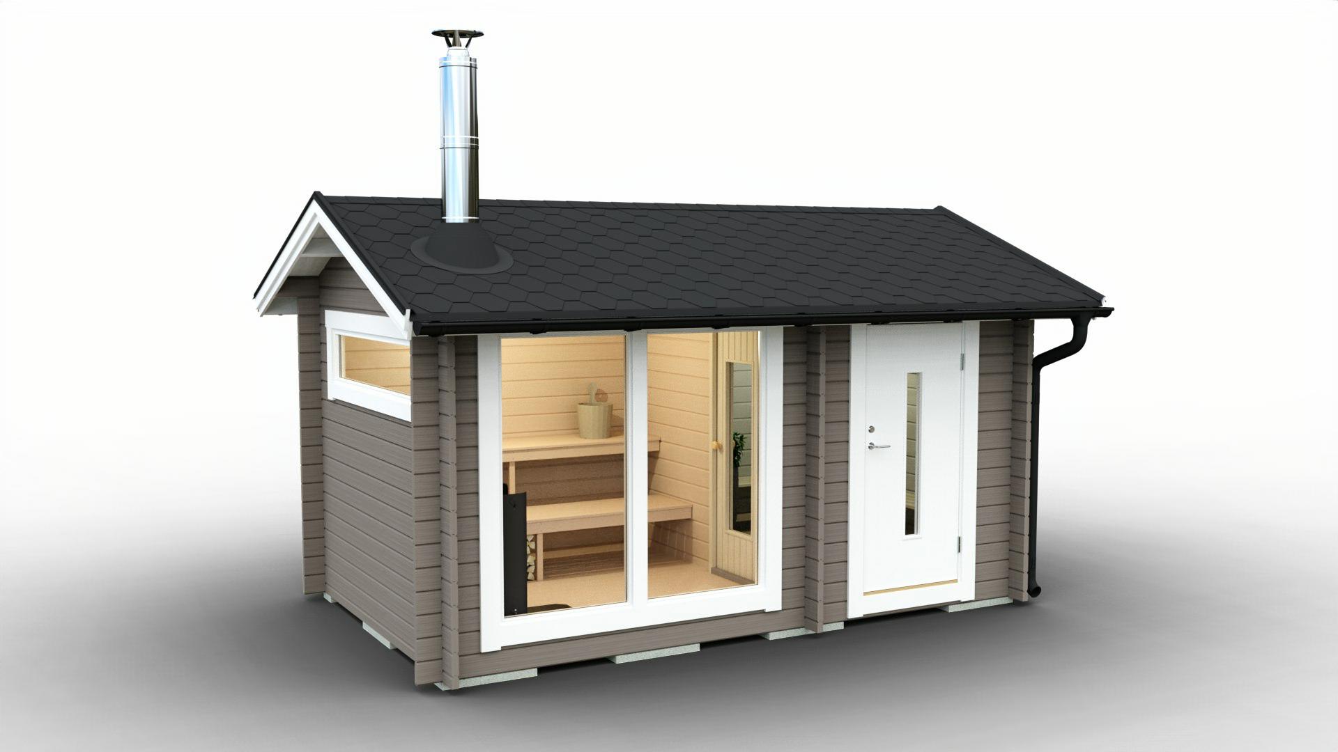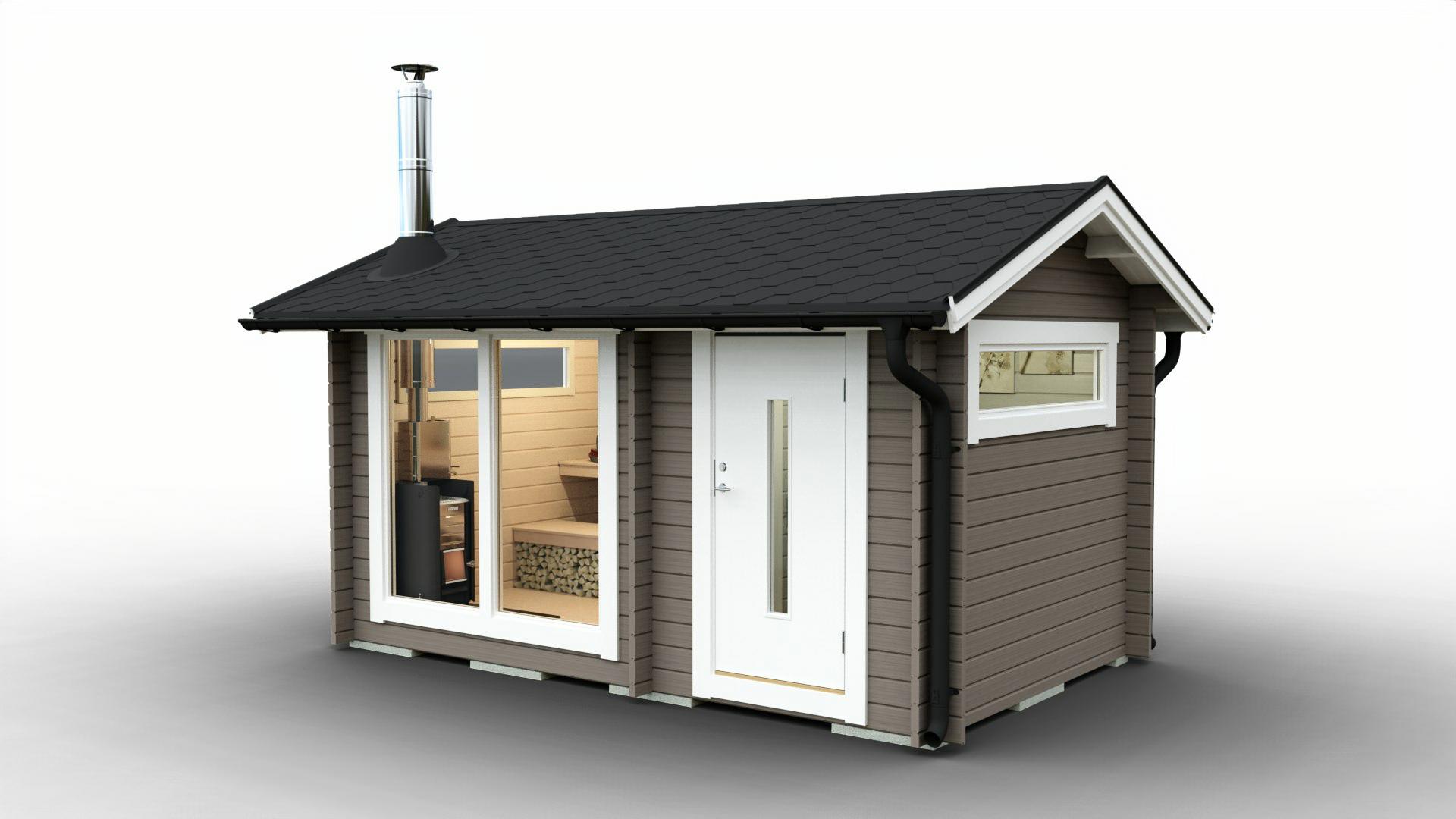 Som tilvalg for denne badstumodellen tilbys våre premium badstukomfyrpakker med beskyttelsesplater direkte på komfyren for å gjøre det mulig å bruke de store vindusflatene. Premiumpakken inkluderer også helisolerte skorsteiner i elegant sort eller rustfritt. Badstupakkene under tilbehør er valgt for den store badstuplassen.