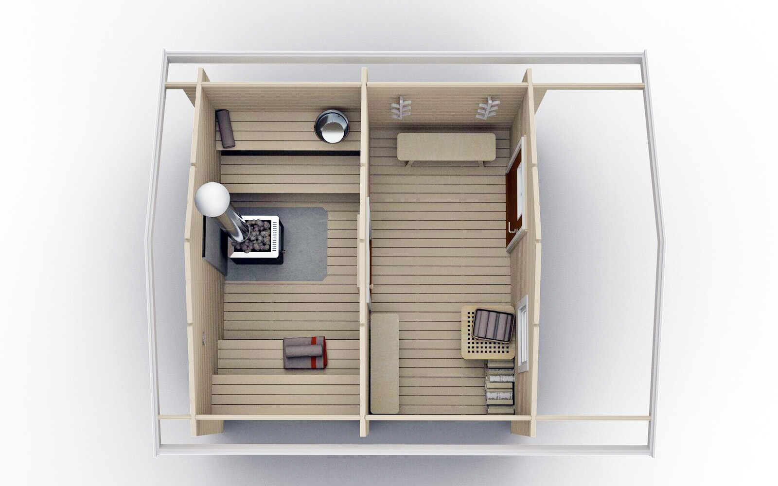 Badstuhytte Småskär 9,9 kvm tilbyr både romslig badstuedel sammen med garderobe. Denne modellen inneholder 4 badstubenker, 2 på hver side av badstuovnen, noe som gjør den optimal for sosiale og hyggelige badstuebad.