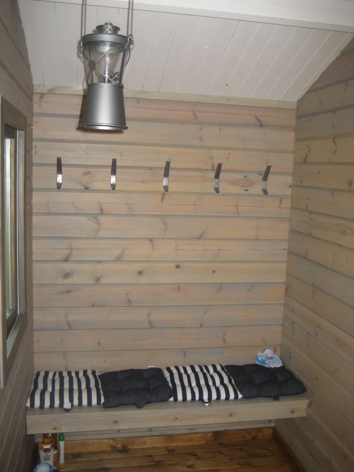 Foder till fönster och dörr. 4st bastulavar med fästen, vill man så kan man placera någon av dessa lavar/bänkar i omklädningsrummet.