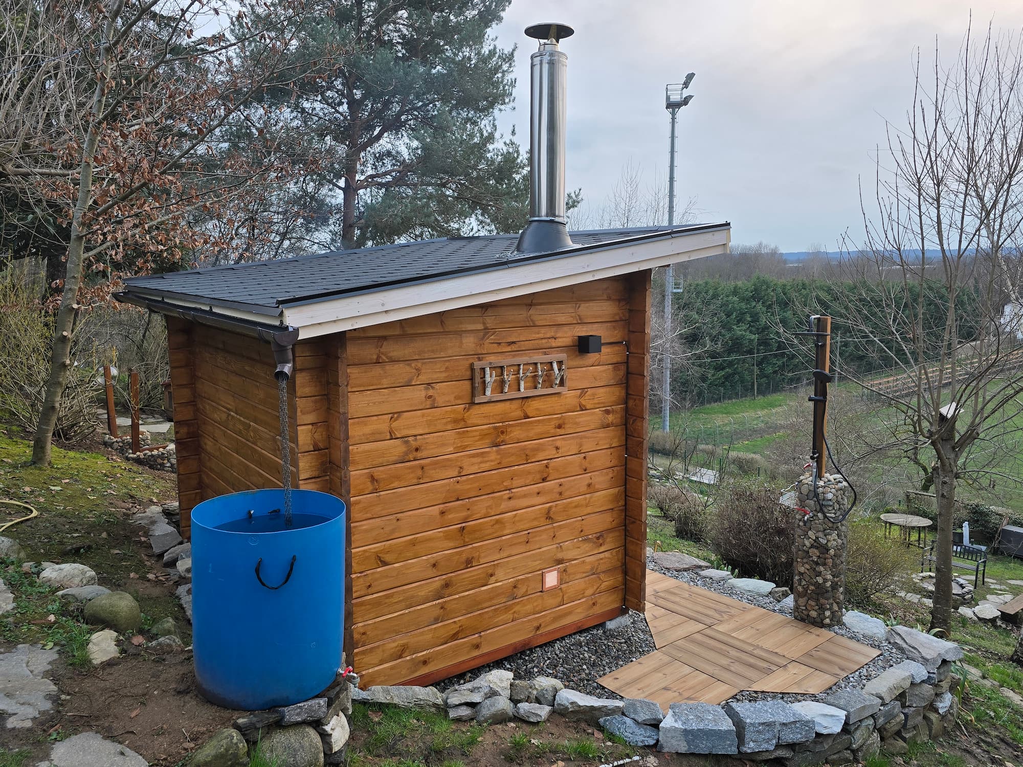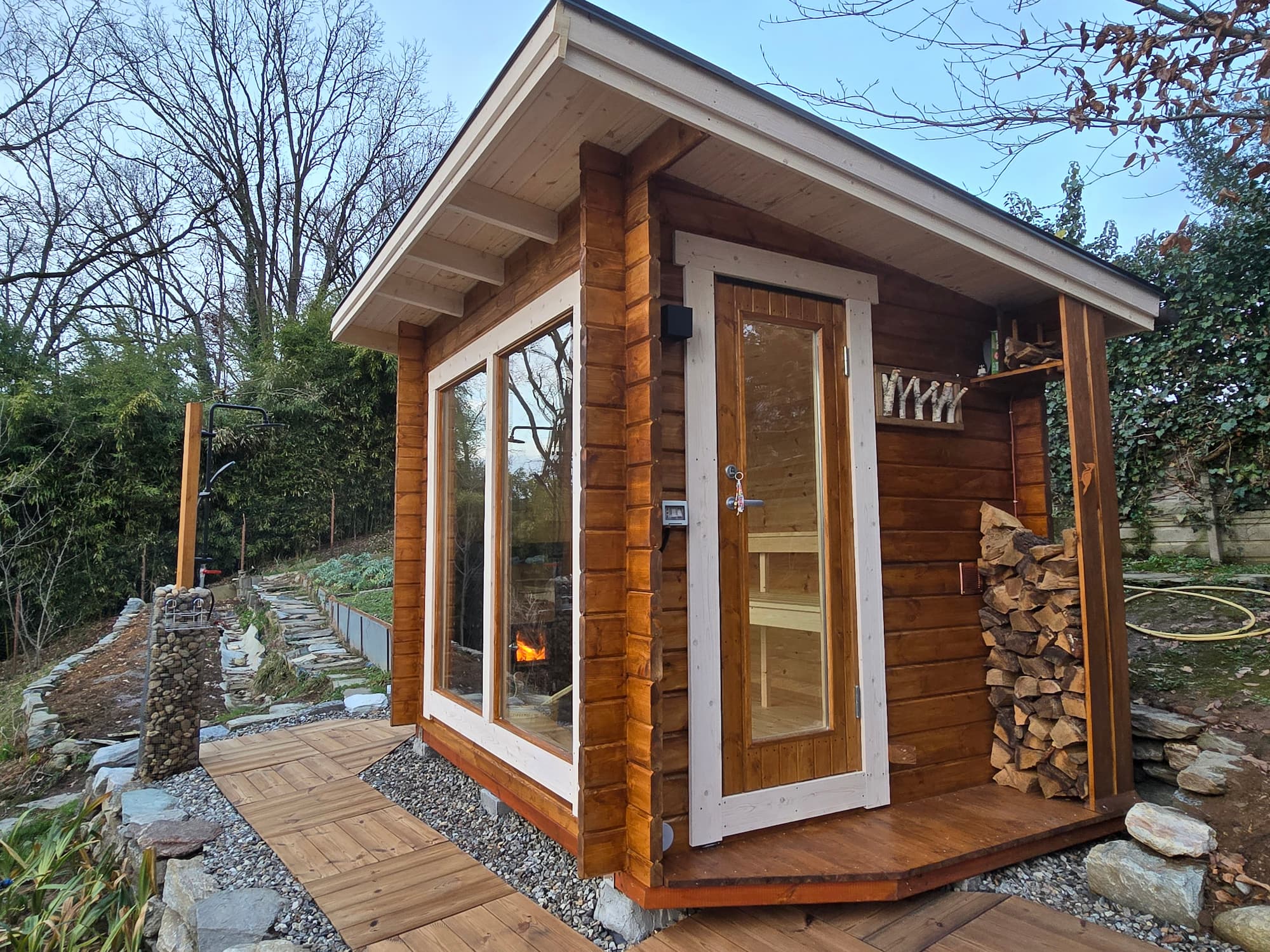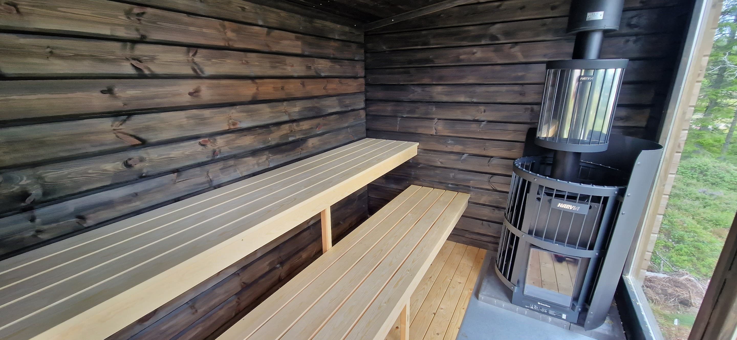 Badstuen på bildene er malt utvendig med jernvitrol og innvendig med svart sauna bets. Dette skal kun ses på som inspirasjon da badstuen leveres ubehandlet.