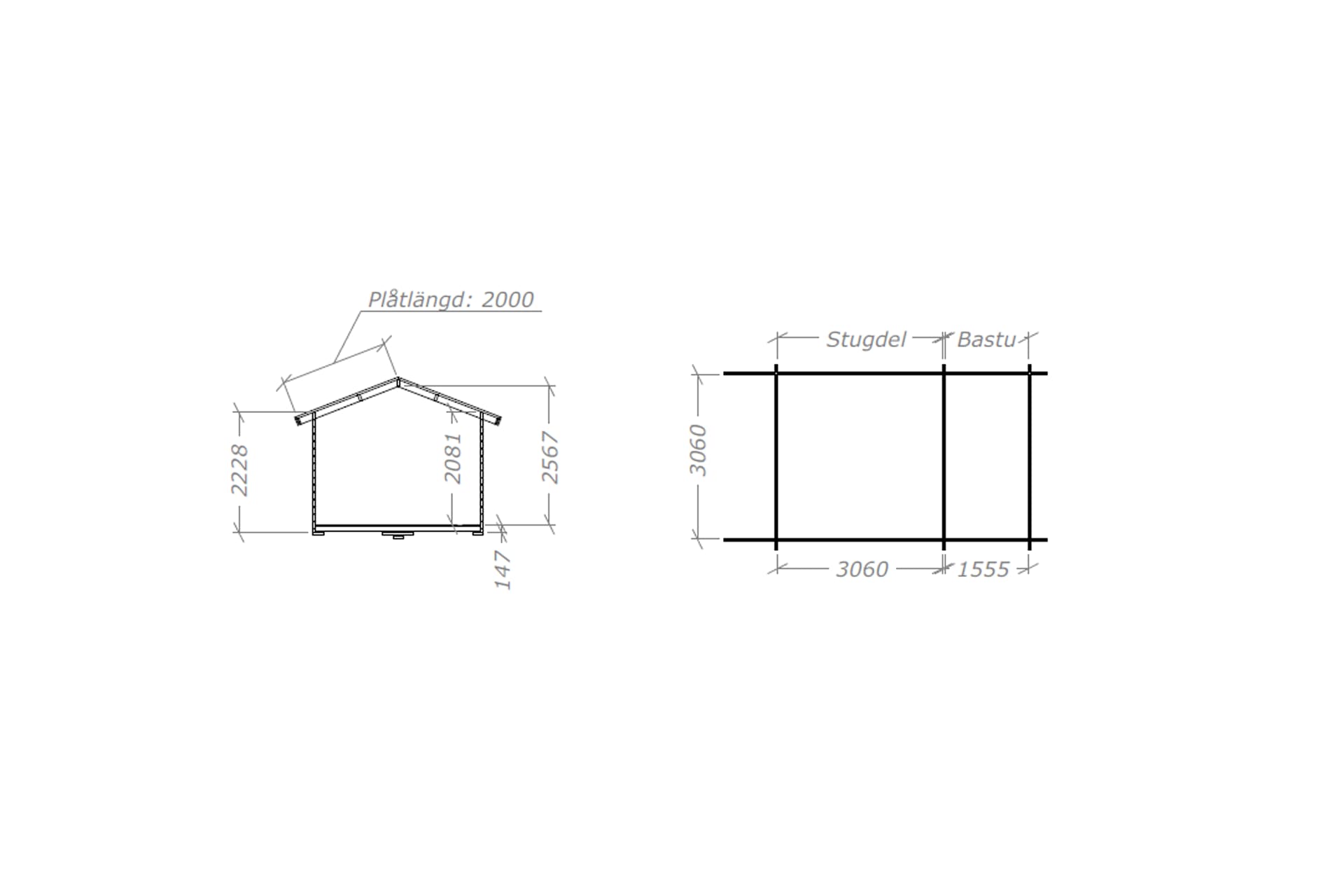 Utv. mått:475 × 315 cm / Inv. mått stugdel 306x306cm bastudel: 155,5x306cm