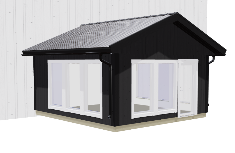 HUSKONFIGURATION - 1.0.5186983 ═══════════════════════════════════════════════════════════════ BYGGNAD: • Storlek: 5×5.50m (27.50m²) • Vägghöjd: 2.387m • Taktyp: Fackverktakstol • Takfärg: Grundmålad vit - Svart 3d-vy • Väggfärg: Obehandlad TEKNISKA SPECIFIKATIONER: • Takvinkel: 22° • Nockhöjd: 3.800m • Gavelbredd: 3.900m • Nocklängd: 6.480m • Längd Taknock till takfot: 3.225m ISOLERING: • Tak: 0mm • Vägg: 0mm MODULER (17 st totalt): • 8X Modul 10x18 3-pane window - m12 • 1X Modul h4v • 2X Modul m3 • 1X Modul h4h • 2X Modul m6 • 1X Modul Front door with large window - m12 • 1X Modul h4v • 2X Modul m3 • 1X Modul h4h • 2X Modul m6 • 1X Modul h4v • 2X Modul m3 • 1X Modul h4h • 2X Modul m6 TAKAVVATTNING: Nej PRIS: • Totalt pris: 177300.00 SEK